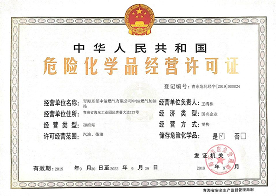为使各项目达到合规化运营条件,青海东部中油燃气有限公司于年内进一步加大了与海东市政府、河湟新区管委会及平安区政府的工作协调力度,取得了较好的沟通效果,经过近两个月的积极沟通和努力,终于在近期取得了平西加油站《危险化学品经营许可证》。