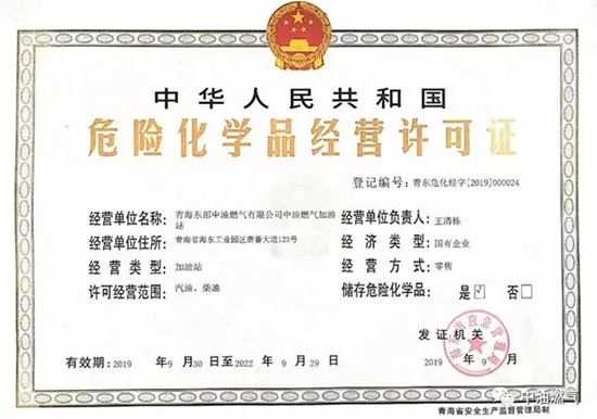 青海东部公司取得平西加油站《危险化学品经营许可证》