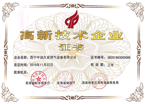 岁末年初,玉鼠献瑞。近日,西宁中油久安燃气设备有限公司继2016年首次取得“高新技术企业”认定后,再次荣获青海省2019年高新技术企业认定。通常高新技术企业具有优秀的科技人才和研发团队,竞争力强,这一殊荣的获得,是青海省对西宁中油久安燃气设备有限公司研发和技术创新能力的充分肯定。