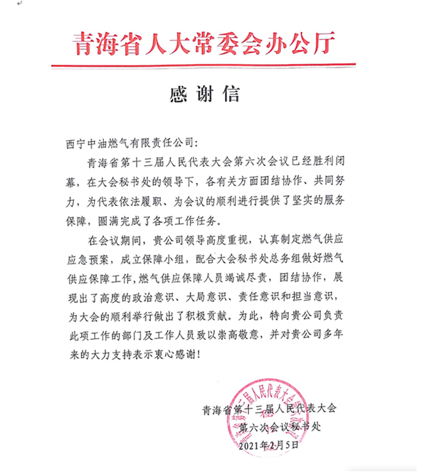 2月5日,省人大常委会办公厅向西宁中油燃气发来感谢信,对西宁中油燃气在省十三届六次会议期间,高度重视,周密部署,尽职尽职,以高度的政治意识、大局意识、责任意识和担当意识做好燃气供应保障工作,为大会的顺利举行做出积极贡献表示感谢。