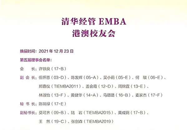 2021年12月23日,清华经管EMBA港澳校友会第五届理事会成功换届,集团董事局主席许铁良先生被推选为新一届校友会会长。