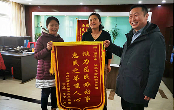 2月21日,西宁中油燃气有限责任公司收到山川北村小区全体业主送来的一面印有“倾力为民办好事、惠民之举暖人心”的锦旗,诚挚感谢公司在安装管道天然气过程中给予的大力支持和帮助。