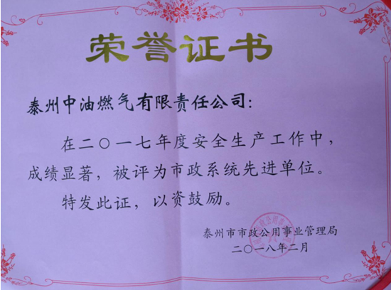 近日,泰州中油燃气有限责任公司被泰州市住建局评为 2017年度“市政系统先进单位”,总经理丁涛荣获“市政系统先进个人”。这是泰州公司建设史上首次获得这一荣誉。