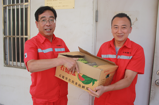 8月3日上午,泰州中油燃气有限公司副总经理曹军繁带领综合办公室人员到一线开展“送清凉”活动,为坚守在基层岗位上的员工送上水果、饮料等防暑降温物品。