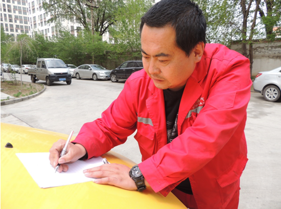 调压箱一般都安装在距离地面1-2米左右的高度,售后维修过程中免不了“上高爬低”的情况,这对于体重90Kg的于鹄鸣来说根本不是阻力,爬梯、半蹲甚至躺卧作业都不在话下,除了流的汗比常人多之外,故障判断和维修手艺从没有落在同事后面。今年上半年在配合西宁公司进行调压箱防护栏安装工作中,他和同事两人在西宁最热的两个月里共安装了防护栏488个,每天平均安装11个,有些小区的调压箱安装在狭小的角落里,他依然能操作自如,测量、打眼、安装、固定一气呵成。大家都说他是全公司最能屈能伸的“大丈夫”。