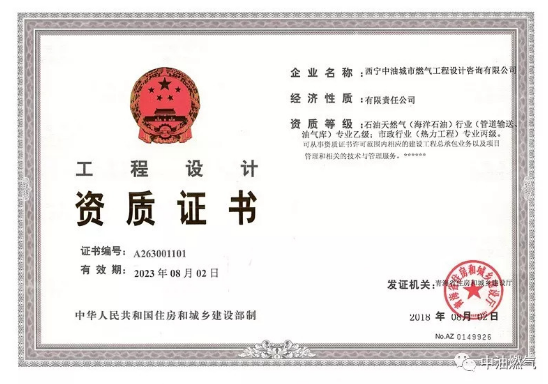 8月21日,经青海省住房和城乡建设厅批准(以下简称省住建厅),西宁中油城市燃气工程设计咨询有限公司取得了工程设计石油天然气(油气库)专业乙级、市政行业(热力工程)专业丙级资质。
