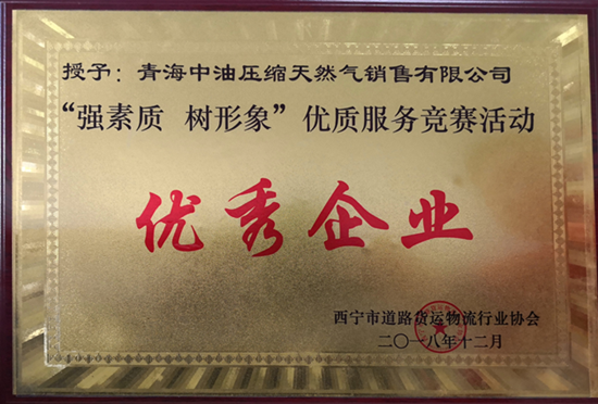 12月14日,青海中油压缩天然气销售有限公司车队在西宁市道路货运物流行业协会主办的道路货运物流行业协会年会(暨安全生产大会)上,荣获获《“强素质树形象”优质服务竞赛优秀企业》奖。