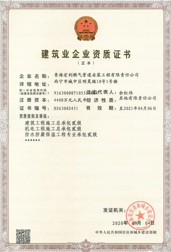 9月4日,经青海省住房和城乡建设厅审查核准,青海宏利燃气管道安装工程有限责任公司成功升级为建筑工程施工总承包贰级资质!