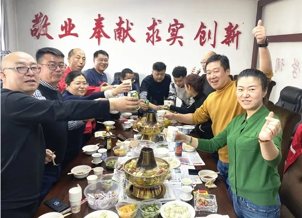 在一楼大厅,大家围在一起擀皮儿、包馅儿,快乐地忙碌着。余红伟总经理一边包饺子,一边与身边的员工们聊工作、聊家常,大家有说有笑,其乐融融。