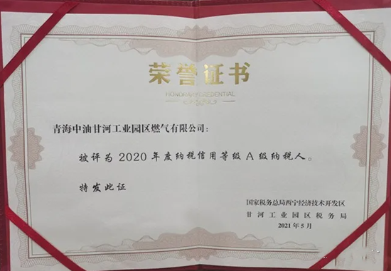 近日,在国家税务总局西宁经济技术开发区甘河工业园区税务局开展的2020年度纳税信用等级评定工作中,青海甘河公司荣获“A级纳税人”称号。