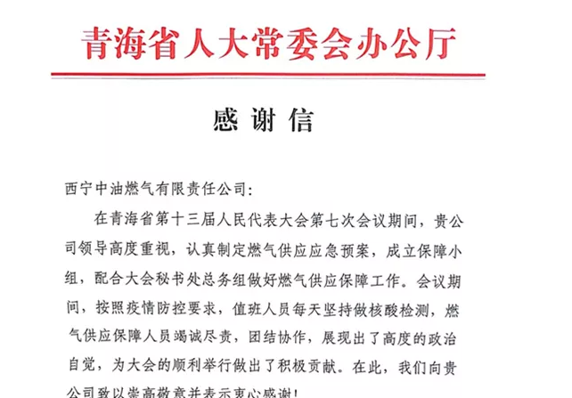 感谢信指出在青海省十三届人大七次会议期间(1月21日-25日),公司领导高度重视,认真制定燃气供应应急预案,成立保障小组,配合大会秘书处总务组做好燃气供应保障工作。会议期间按疫情防控要求,值班人员每天坚持做好核酸检测,燃气供应保障人员竭诚尽责,团结协作,展现了高度的政治自觉,为大会的顺利举行做出了积极贡献。