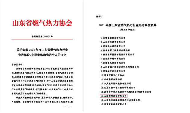 近日,山东省燃气热力协会公布了《关于表彰2021年度山东省燃气热力协会先进单位、先进集体和先进个人的决定》(鲁燃热协字[2021]1号),对在2021年度燃气热力行业中做出突出贡献的单位及个人进行表彰。山东胜利股份有限公司被授予“2021年度先进单位”荣誉称号。这也是公司连续第三年,荣获山东省燃气热力协会“先进单位”荣誉称号。