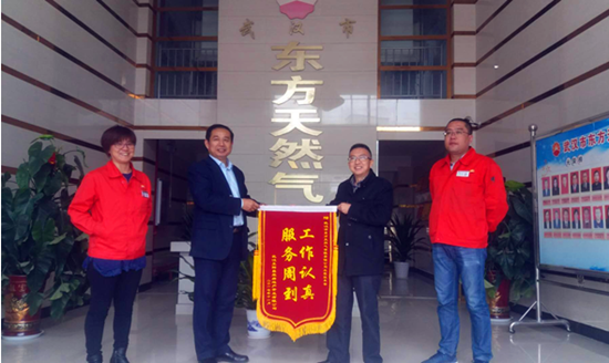 11月15日,武汉正阳昌荣房地产开发有限责任公司负责人来到武汉市东方天然气有限责任公司,送来一面绣有“工作认真、服务周到”的锦旗,对武汉东方公司给予的大力支持表示感谢!